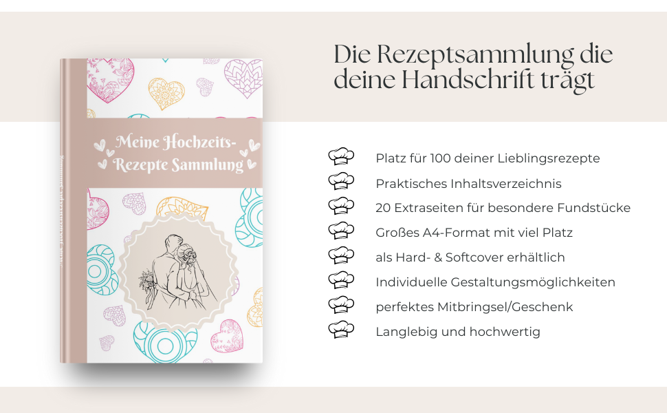 • Individuell anpassbares Design: Jede Seite ist im eleganten Hochzeits-Stil gestaltet und bietet dir genügend Platz für Zutatenlisten, Zubereitungsschritte und persönliche Notizen.